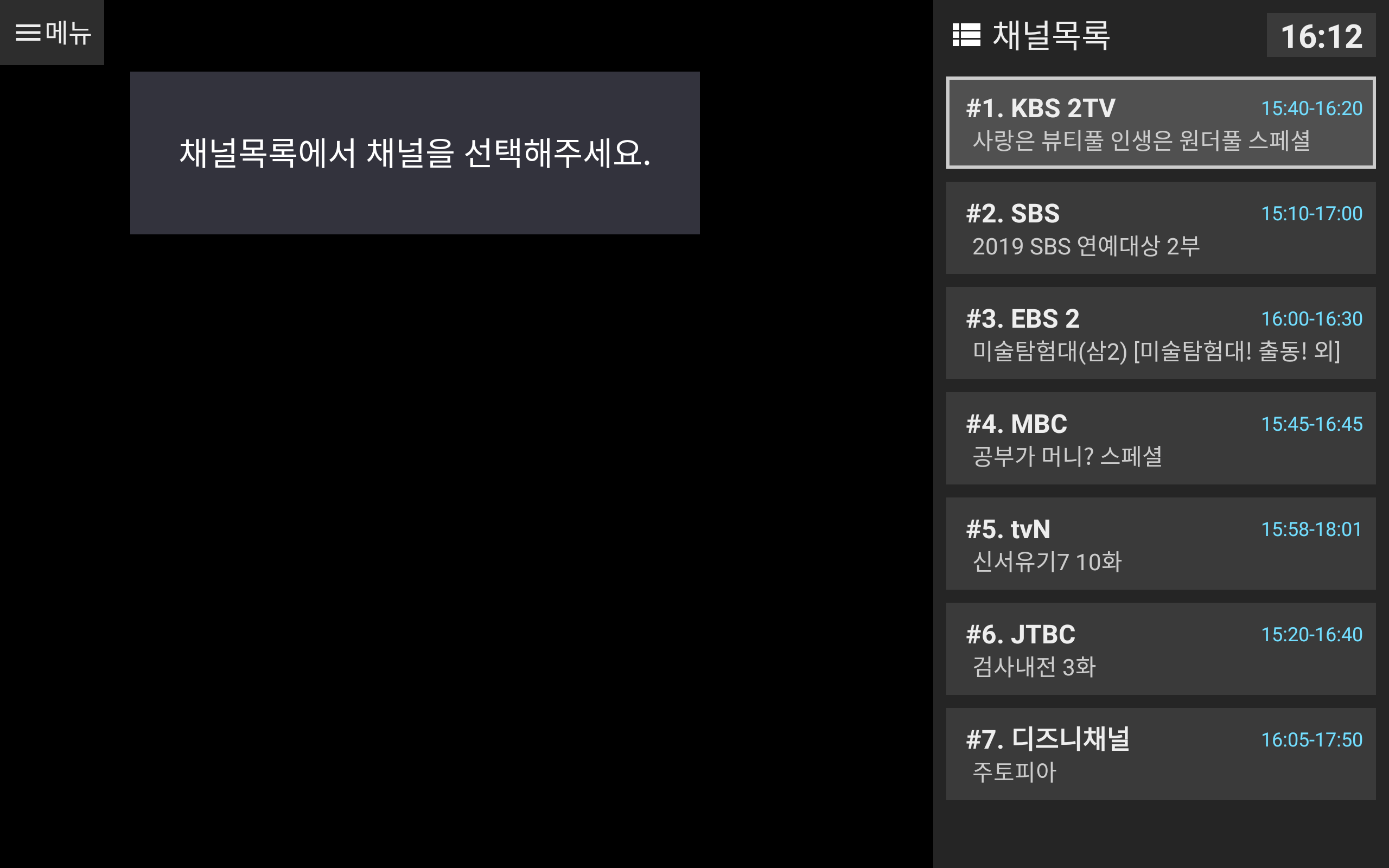 나의 채널에 등록된 채널 목록이 실시간TV 화면에 표시됩니다.