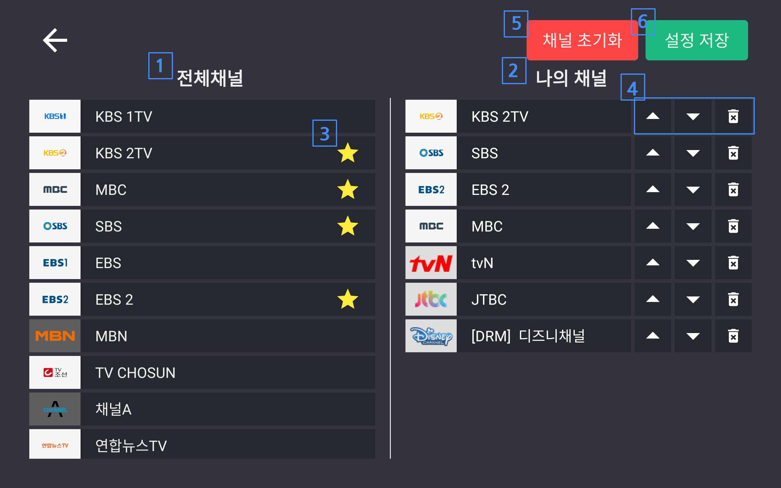 4번의 버튼들을 이용하여 채널의 순서를 바꿀 수 있고 해제 할 수도 있습니다.